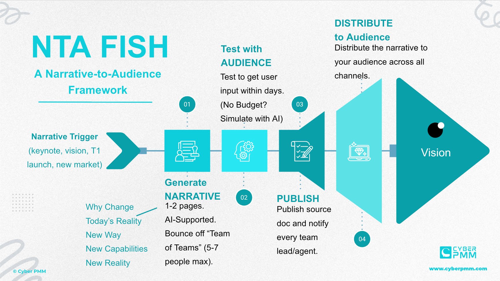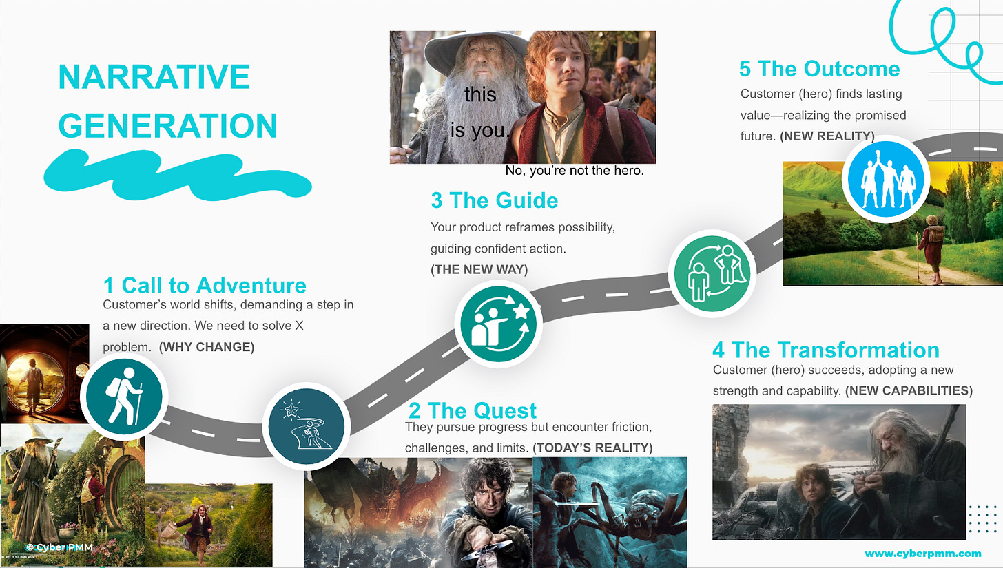It uses the storytelling techniques from Joseph Campbell’s Hero’s Journey, and connects the Cyber PMM app to distribute the narrative to your audience.