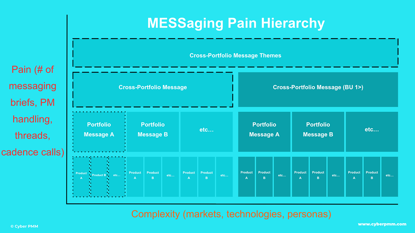 After Optiv, I’ve since learned that in larger companies, Messaging is in fact a Marketing superpower. There’s a place for storytellers. I’ve seen multi-billion dollar portfolios with messages layered on top of messages. I call this the Messaging Pain Hierarchy.