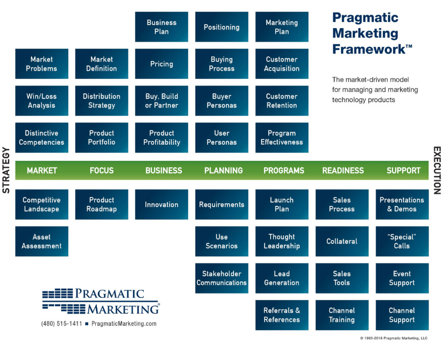 Then I entered greener pastures to work for a company called Optiv and I decided to lean into the Product Marketing craft, still not realizing what Messaging was. I attended a training class called “Pragmatic Marketing” to try and learn the ropes. They barely talked about Messaging. The instructor even handed out this chart with 30+ functional boxes on it, and the terms Messaging or Narrative aren’t even included on it.