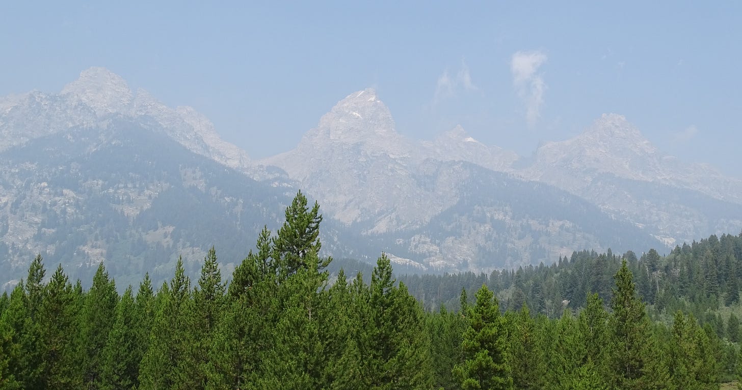 I was so disappointed when arriving at Grand Teton. It was a foggy day, and I hadn’t seen a single mountain yet. What a let-down. Little did I know the Grand Teton mountains were only a few minutes from appearing before our eyes. As I drove closer, some clouds moved, and I parked to see this amazing mountain range. I shouted to my wife, ‘Look, there they are honey!’ (the picture below is what we saw, yet doesn’t do the experience justice).
